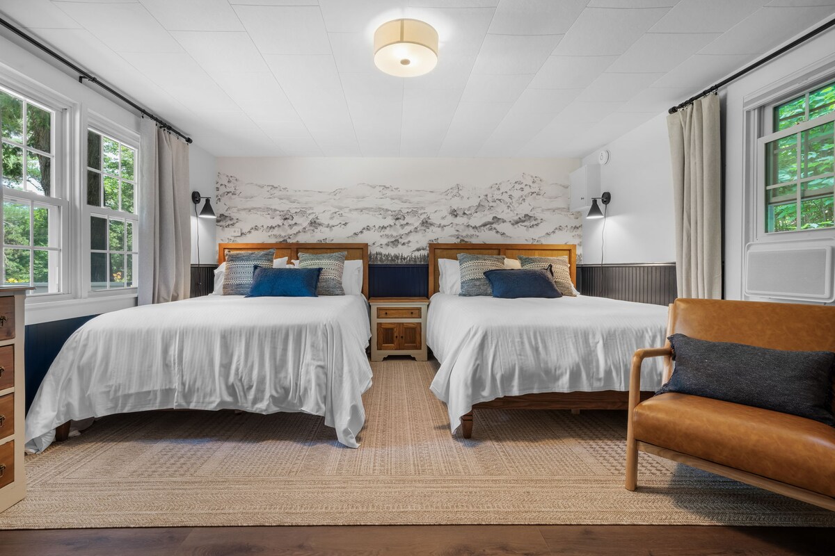 Discover the perfect balance of connection and privacy in our renovated Woodland Duet. This setup features two interconnected queen suites, each offering its own private bathroom and amenities—ideal for friends traveling together, couples seeking their own space, or parents looking for a bit of separation from their children. Walk outside your door and find yourself steps away from the meadow, bonfire pits, and the scenic path leading directly to the Saco River.