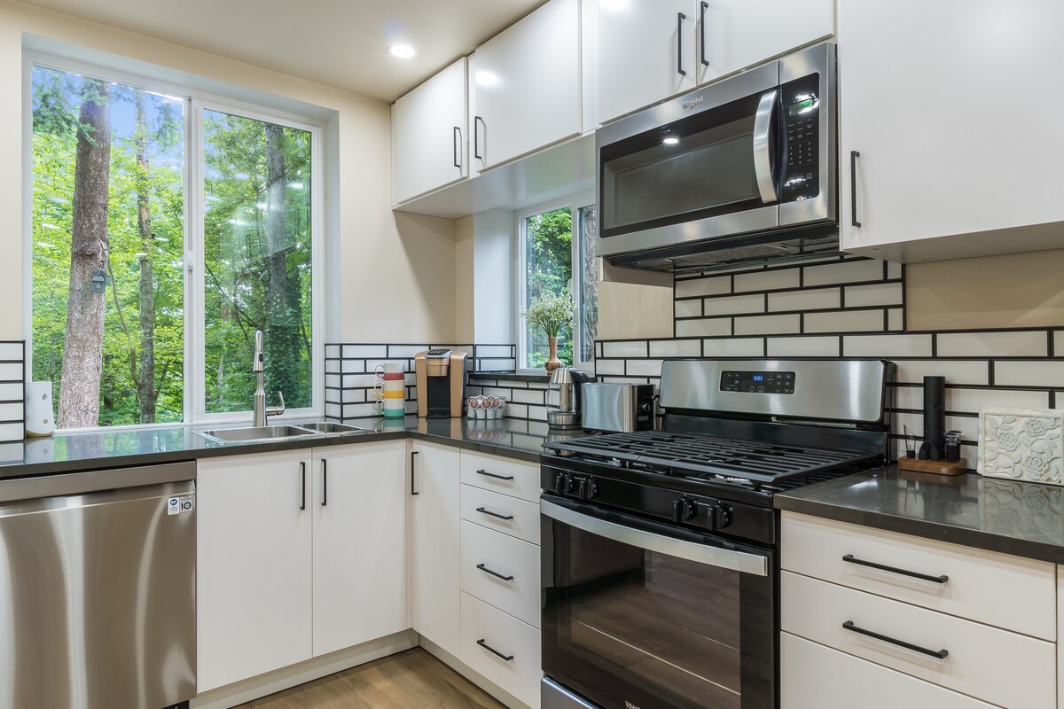 FREE ON-SITE PARKING INCLUDED. THIS IS A FULLY PRIVATE, SELF-CONTAINED STUDIO — NOT A SHARED ROOM. IT HAS ITS OWN SEPARATE ENTRANCE WITH NO SHARED SPACES OF ANY KIND. THE STUDIO INCLUDES A FULL KITCHEN WITH STOVE, MICROWAVE, REFRIGERATOR, COOKWARE, AND DISHES — EVERYTHING NEEDED FOR DAILY LIVING. ENJOY A 65" SMART TV, FAST WI-FI, AND A QUIET, PRIVATE SETTING WITH A BEAUTIFUL FOREST VIEW.