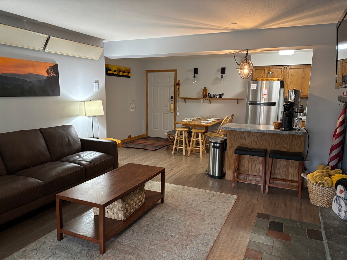 Killington山日出村(Sunrise Village)的滑雪場內外舒適山間公寓,配有真正的木製壁爐和加大雙人床。更新包括主臥室和客房的所有新家具、美食廚房的所有新頂級不銹鋼電器、裝飾精美的客廳、全新的雙人床尺寸的沙發床和配套的椅子。只需步行到停車場盡頭即可抵達滑雪道。我擁有相鄰的單位-更多資訊如下。