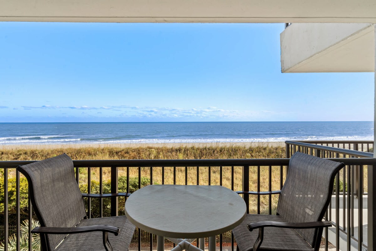 翻新的海濱!全新廚房,配有石英檯面! 想像一下,在這個景觀中品嚐晨間咖啡! 3間臥室, 3間全功能浴室公寓! 可供8人入住,配有4張牀和2張單人地板牀墊。 祥和的海灘,景點近在咫尺! 距離Barefoot Landing不到1英裏,有商店、餐廳和音樂娛樂。 參觀眾多高爾夫球場、海灘百老匯、丹吉爾門店、卡羅萊納奧普里、海盜之旅、高爾夫球場,距離僅幾分鐘路程。