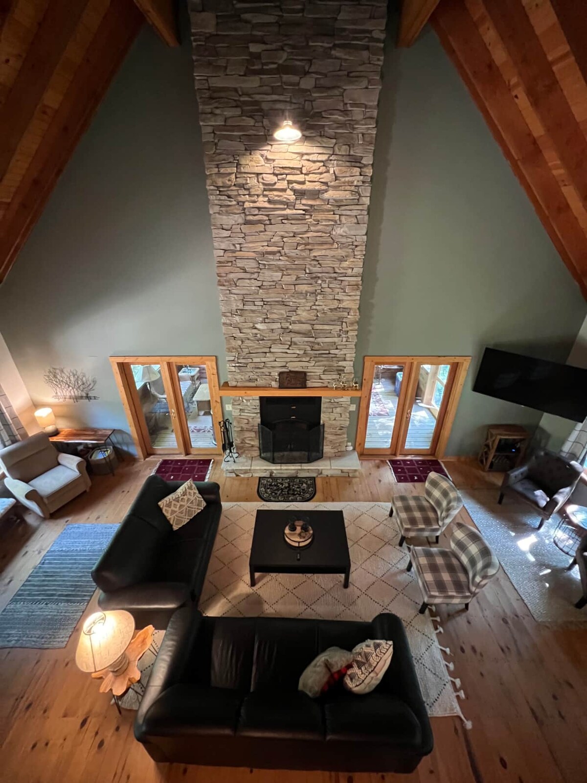 Lakewood Lodge is a striking modern chalet set on five private wooded acres just outside Sister Bay. Soaring floor to ceiling windows nearly 30 feet tall flood the home with natural light and frame peaceful views of the woods and on site pond. Enjoy central air, a cozy fireplace, sunroom, private deck, fire pit, and a quiet setting just minutes from dining, shops, and the waterfront.