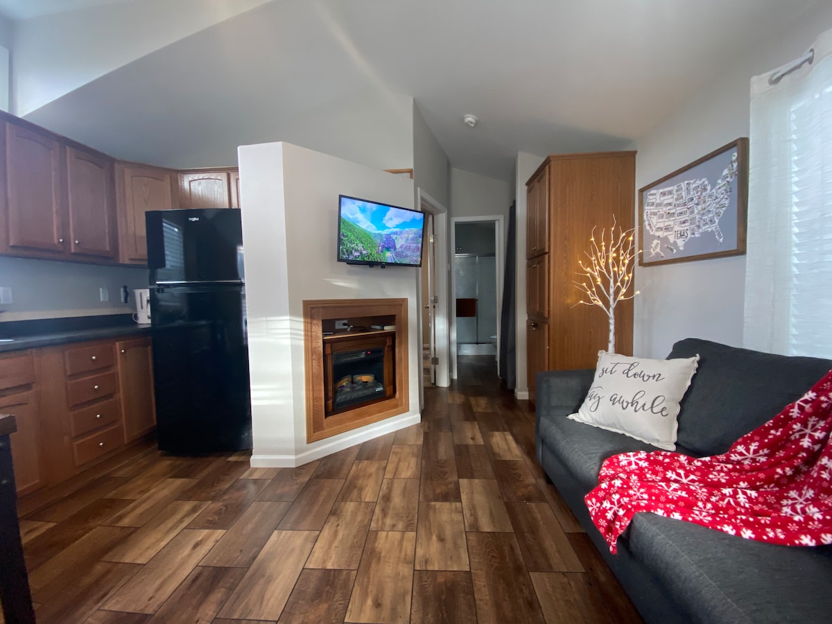 Woodland Park tiny house with Pike’s Peak mountain views — minutes to Cripple Creek, Ice Castles & hiking. Walk to Starbucks, Safeway & local shops. Ideal for couples or remote work with fast WiFi, full kitchen, electric fireplace & self check-in. Cozy winter escape with tea & cocoa station. 4WD/AWD required Sept–May for safe access.