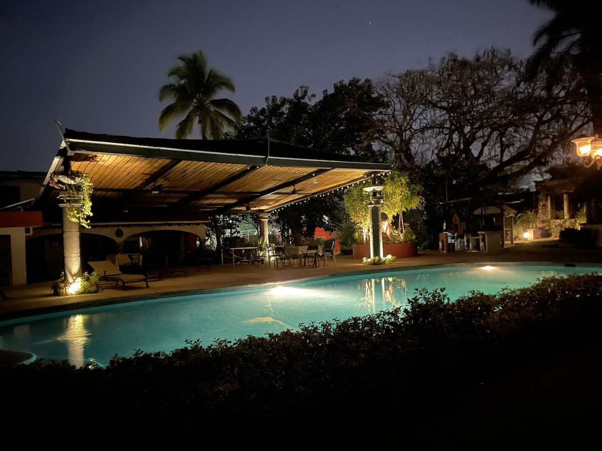 VA 是兩個大型天台下的寧靜避風港,非常適合參觀墨西哥花園或附近多個活動大廳的人士。 我們有 3 間獨立的平房,配有 Wi-Fi、浴室、電視、空調和便利設施,可供 8 人放鬆身心。 設備齊全的烤肉區、廚房和餐廳,配有所有烹飪和上菜的用具。 酒吧區、吊床和泳池周圍的搖椅,供房客專用。