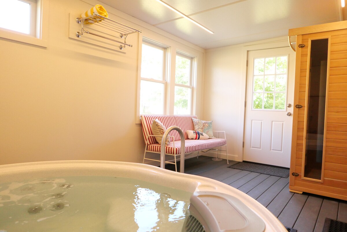 Lotus是您的禪宗家園。 在您的私人後露臺上享受寧靜祥和,體驗令人驚豔的鹽水熱水浴缸(獨享)、全新桑拿房、季節性戶外加熱淋浴、深浴缸(身高超過 5 英尺 5 英寸的人淋浴可能不太方便),以及藍牙音箱。舒適的加大雙人床配有歐式床品,一樓還設有一張單人折疊泡棉床墊,一樓剛裝修成另一個休閒區,配備 70 吋電視、唱片機、吊床和吊椅。