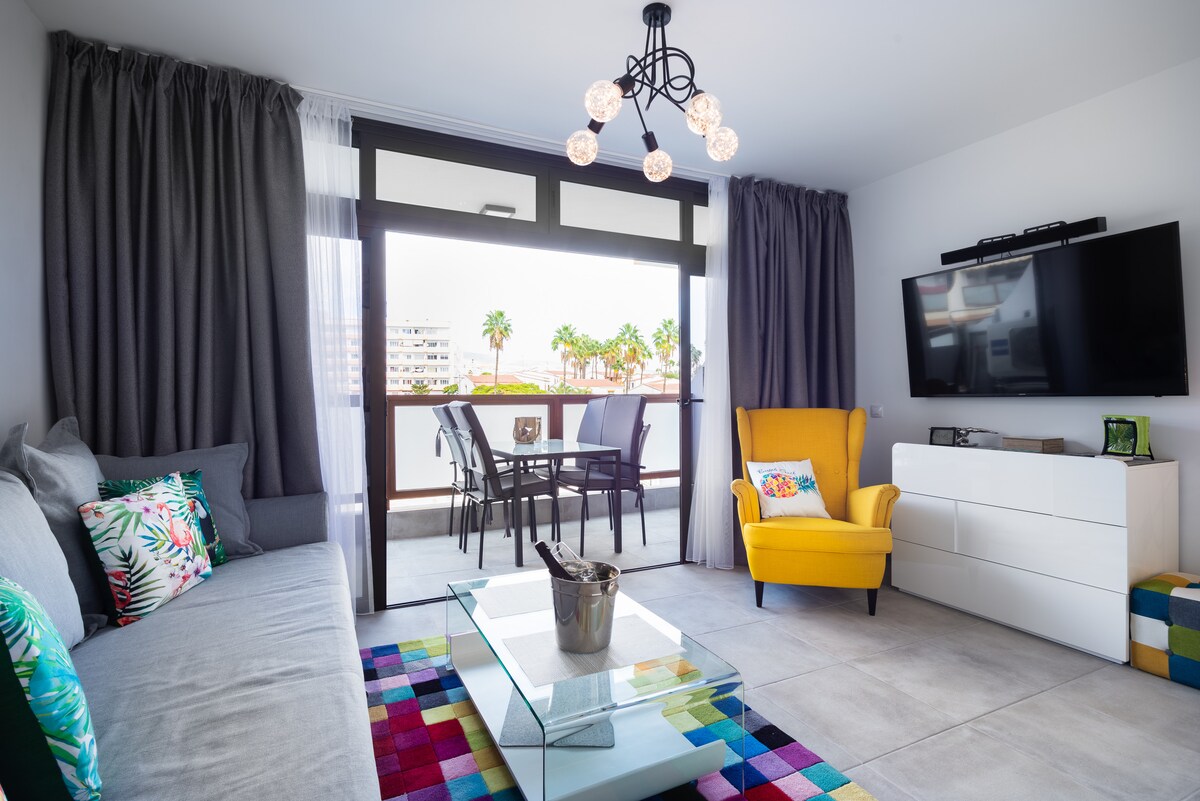 美麗、現代化的全新翻修公寓,有一間臥室、一間客廳、設備齊全的廚房和漂亮的陽臺(泳池景觀)。兩台安靜的空調 免費高速光纖網路和良好的工作場所。洗衣機。 距離美麗的馬斯帕洛馬斯海灘500公尺,街對面有大型超市,超級靠近Yumbo中心(步行5分鐘)。 美妙的屋頂露臺(山景和海景) ,您可以在有或沒有衣服的情況下放鬆和日光浴(電梯可輕鬆帶您上樓)