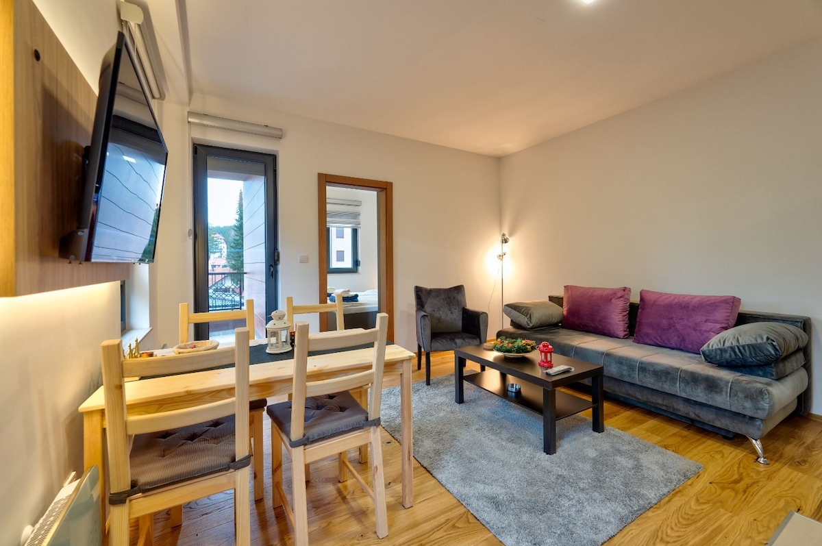 茲拉蒂博爾區域是山區天堂。當您在高大的松樹之間巡遊時,您會立即感到放鬆。當您進入我們的全新公寓時,您會有那種「家的感覺」。這間全新的單臥室公寓設備齊全,包括壁爐。躺在高級床墊上,讓您睡得像嬰兒一樣。大樓是一棟安全的建築,前面有免費停車位。再完成幾個步驟就能抵達市中心和所有活動