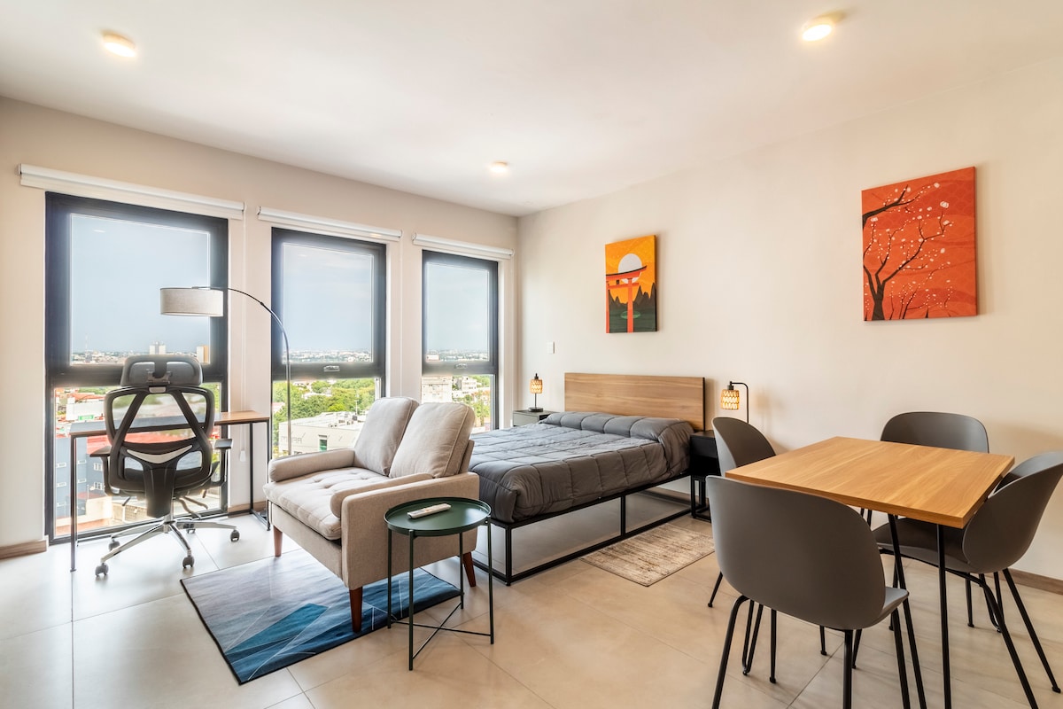 19樓閣樓,可欣賞全景! 配備冷氣、洗衣機、烘乾機、油炸鍋和高速網絡。 優質的家具,舒適和溫馨。 有蓋泊車位和24小時保安 位於瓜達拉哈拉最酷的地區,您可以步行、騎自行車、乘坐公共交通工具或開車;靠近餐廳、酒吧、博覽會、廣場、公園、森林、市中心。 我們會在每位旅人入住前進行消毒,確保旅居乾淨安全