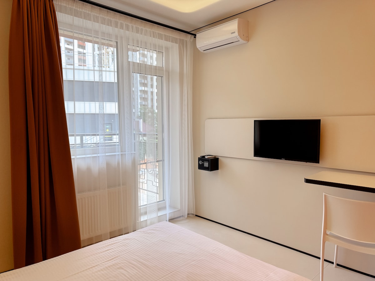 Стильный номер в гостинице общей площадью 35 м, который находятся в пешей доступности к морю. Имеется бассейн, спортзал, закрытая охраняемая территория. Просторная гостиная, санузел. Есть место для машины во дворе и гараже. Предлагаем вам отдых в статусном отеле премиум класса, который находиться на ул. Леваневского, в одном из наиболее престижных, районов города. Невысокое количество номеров выгодно выделяет среди современных новостроек.