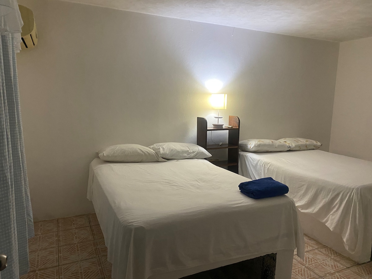 The space is a large room with two queen size beds, a dresser with a mirror and private bathroom with a spacious dressing room. The rooms are in quiet zone, 15 minutes walking to Zihuatanejo's dowtown and the beach. At the entrance there is a restaurant, that also has a open space.