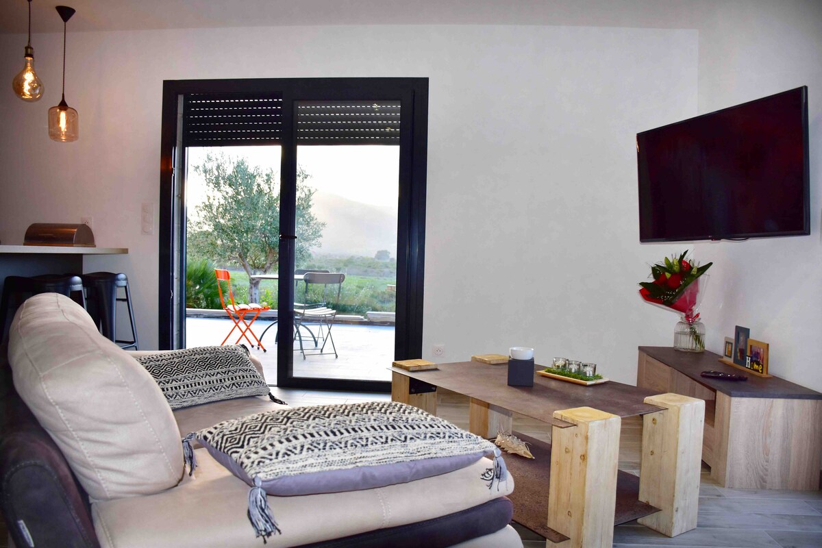 我們提供三星級旅遊客住宿,配有空調,可欣賞海景和山景,位於一棟獨立房屋的一樓,安靜地坐落在一座十四世紀小村莊的果樹林中,在一個花園露臺上,介於卡爾維和伊勒魯斯之間。 現代而精緻,坐落在歷史遺址之中:科爾巴拉修道院 (couvent de Corbara)、聖三一教堂 (église de la Ste Trinité)、海灘、村莊(皮涅 (Pigna)、聖安東尼奧 (San Antonino))和徒步旅行路徑,這些都是多次報導的景點,可在網路上找到。