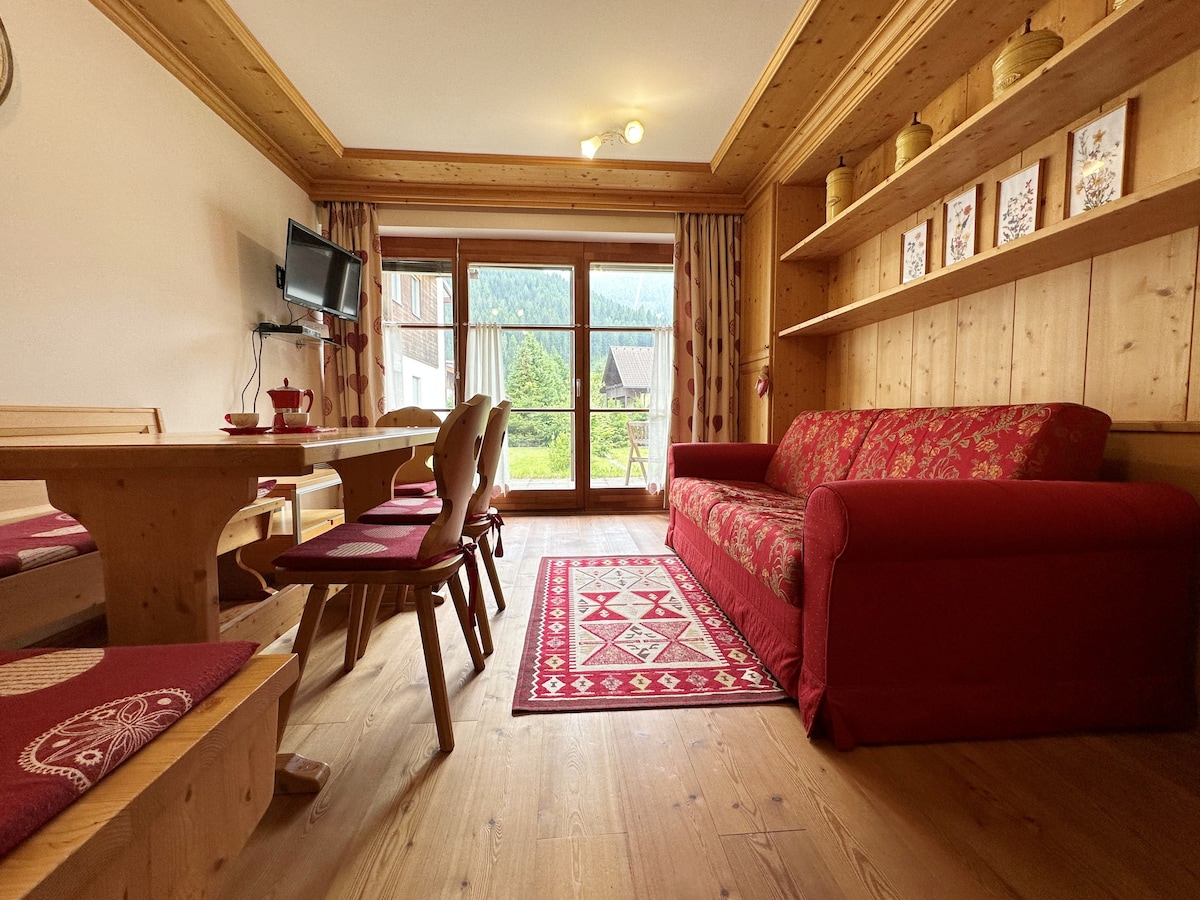 Grazioso e soleggiato appartamento al piano terra in piccola palazzina. Una camera con un letto matrimoniale e un letto a castello per i bambini, soggiorno luminosissimo con divano-letto. Cucina attrezzata con lavastoviglie, microonde, macchina caffé "Dolcegusto", bagno con doccia, bidet e lavatrice, piccola skiroom e posto auto privato in garage.