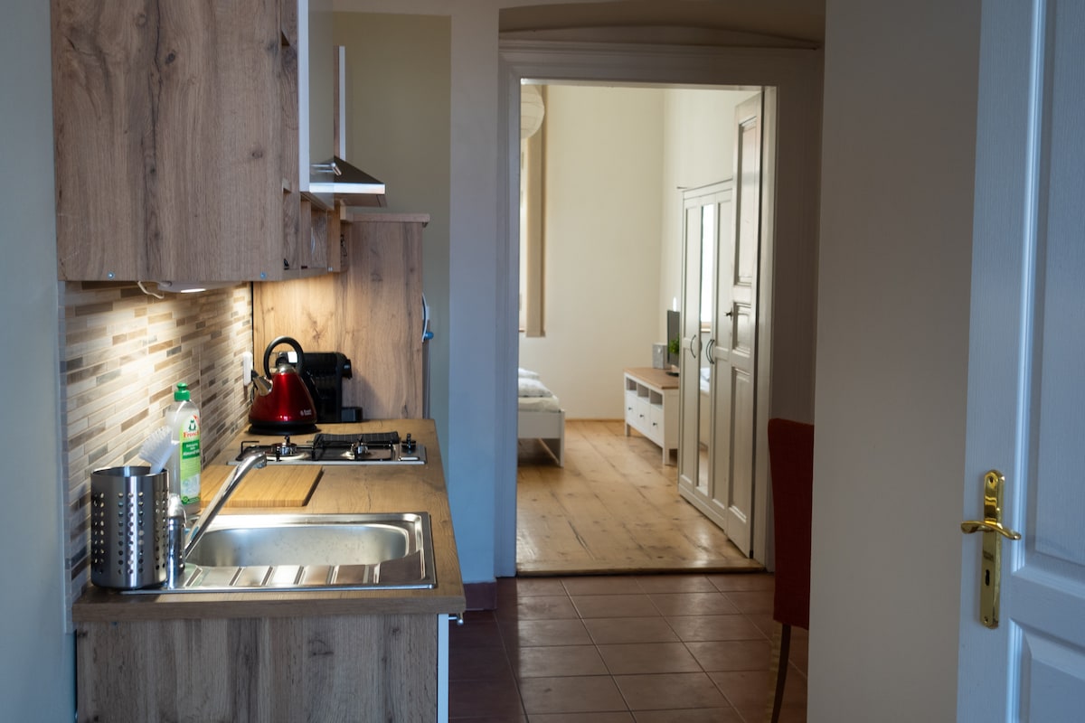 寬敞明亮的地方,在舊住宅區享有獨特的景觀。公寓配備豪華家具,讓您在住宿期間享受舒適。設備齊全的廚房、帶淋浴間和浴缸的浴室,可欣賞壯麗景色、配有Netflix的電視、安靜的臥室和舒適的床。 咖啡廳、麵包店和小酒館、有最好的捷克啤酒和美食的酒吧,隔壁就是當地市場。直接乘坐公共交通工具前往機場、火車站、布拉格城堡、舊城區天文鐘。