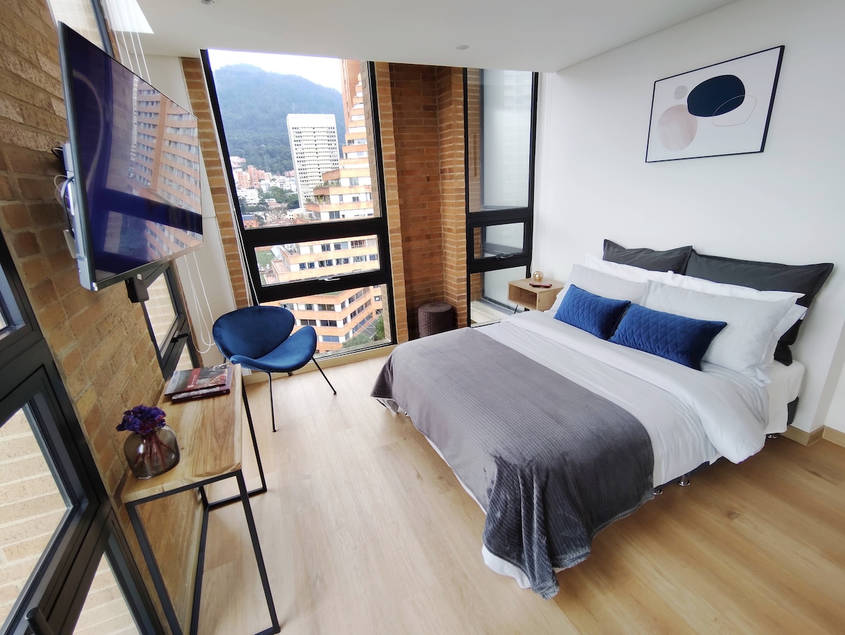 Stay at our stylish studio apartment, within walking distance of the best restaurants, shopping districts, and posh neighborhoods. The city is undergoing a few road repair projects; several streets are closed due to the construction of the Bogotá metro. However, you should not have issues accessing our building. Our apartment has a large private balcony, offering panoramic mountain and city views. You’ll appreciate the uninterrupted views from our 10th-floor escape.