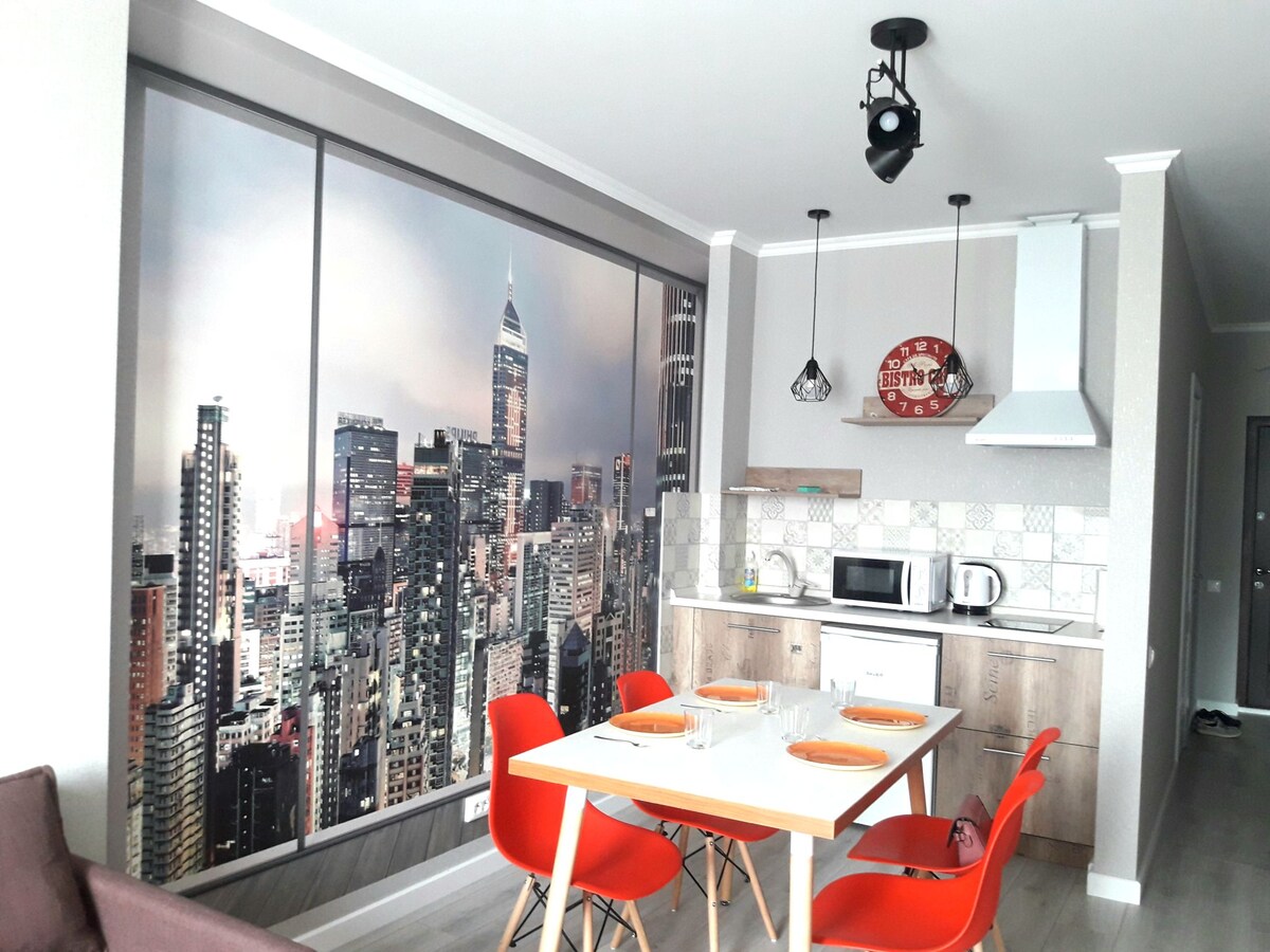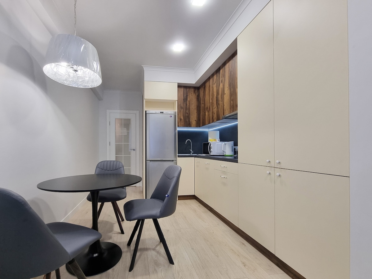 這間公寓很舒適。此外,還有舒適的工作場所和家庭式的設備齊全的廚房。 附近有很多設施:超市、餐廳、健身房。 地理位置優越,距離市中心、機場和火車站同樣遠。 乘坐計程車前往機場需15分鐘。